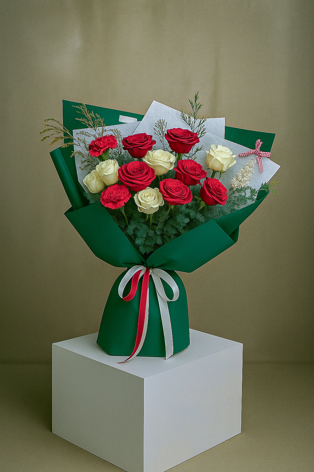 In this exquisite ensemble, the warmth of pink blossoms symbolises a gentle embrace, while the purity of white flowers whispers of innocence and deep admiration. Each bloom is carefully chosen to create a harmonious balance, crafting an arrangement that's both visually stunning and emotionally resonant.