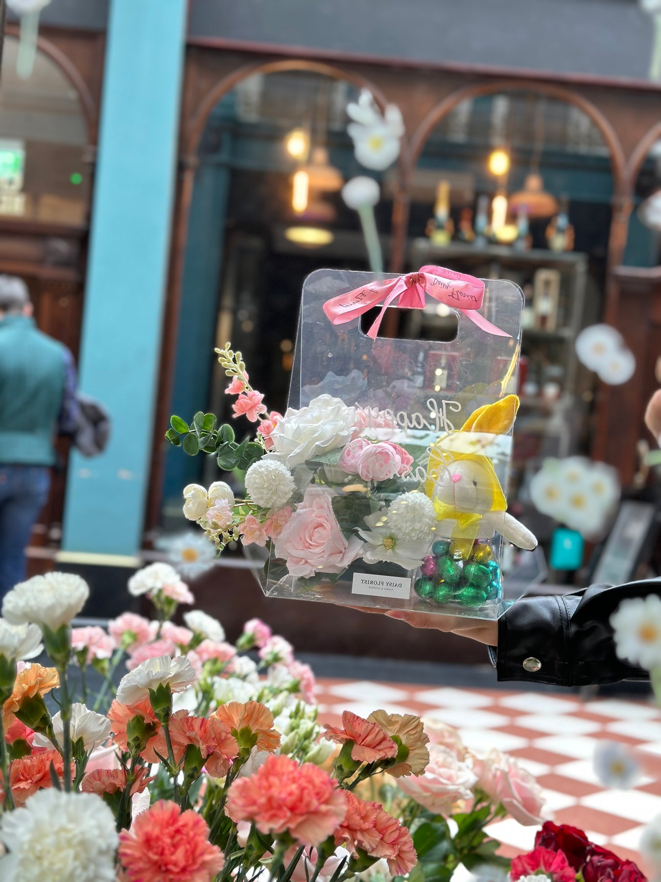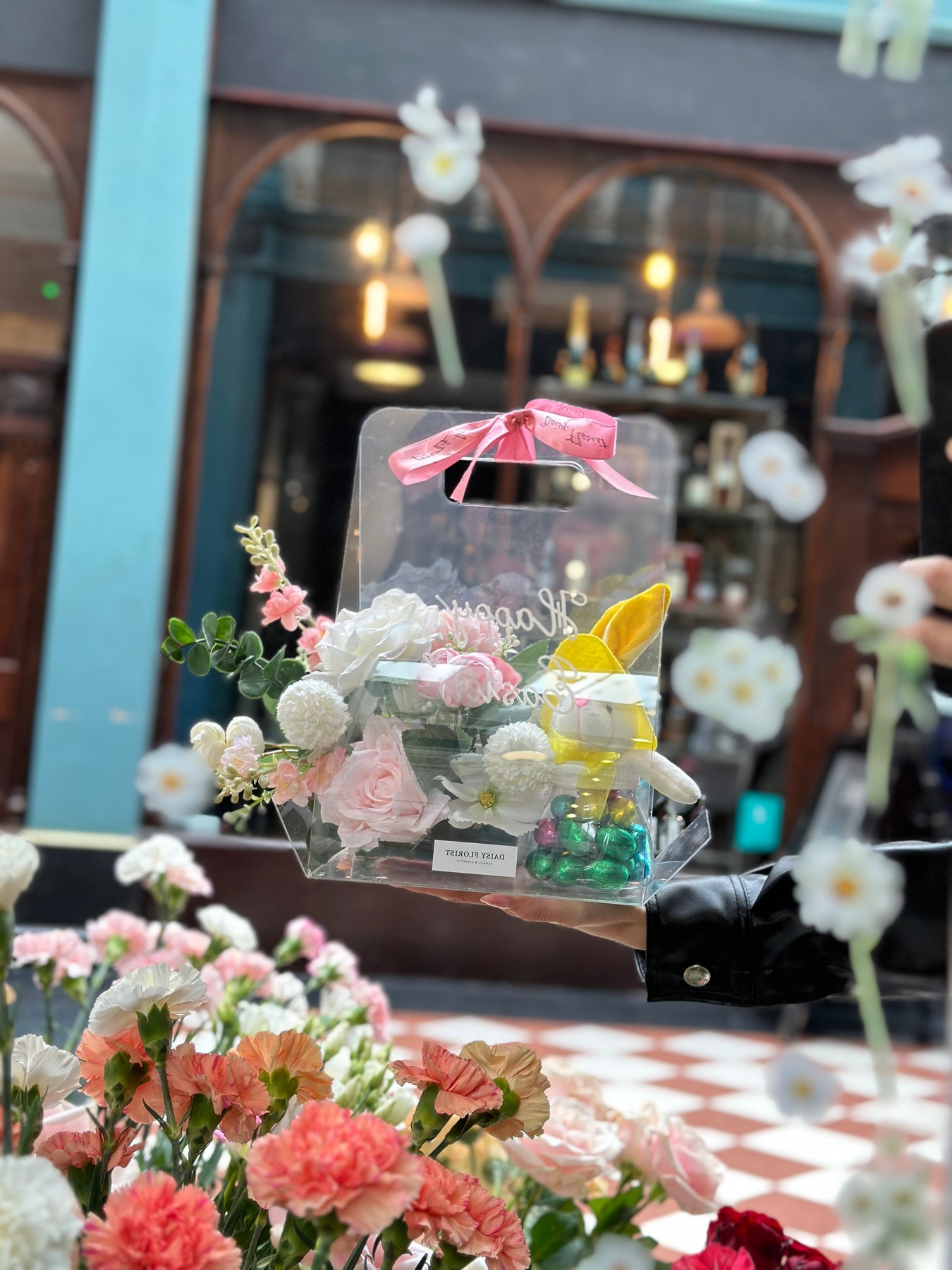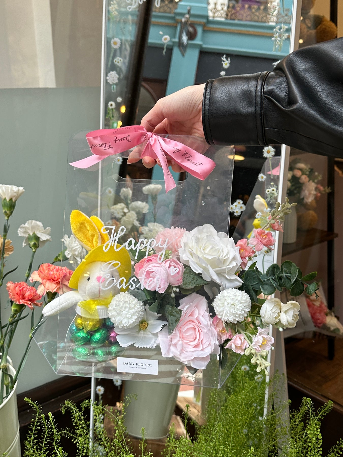 Hand-arranged with the freshest flowers, each box bursts with a mix of seasonal favourites, from the soft pastels of delicate tulips and fragrant hyacinths to the cheerful hues of daffodils and ranunculus. The added touch of a whimsical bunny nestled amongst the blooms brings a playful twist to this elegant arrangement.
