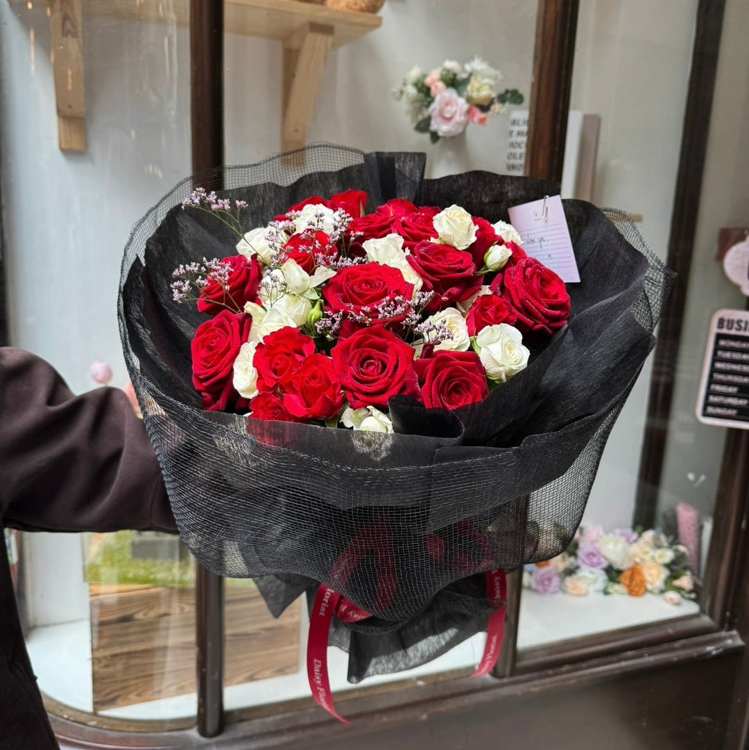 A Bouquet of Red Roses with White Spray Roses & Limonium